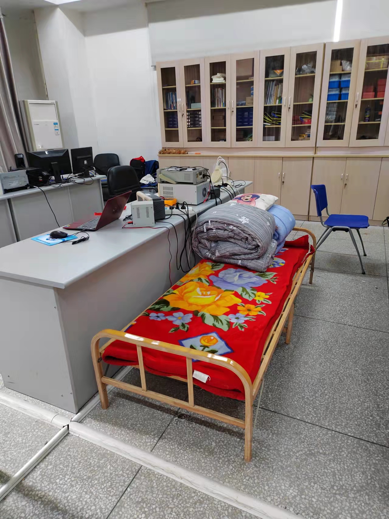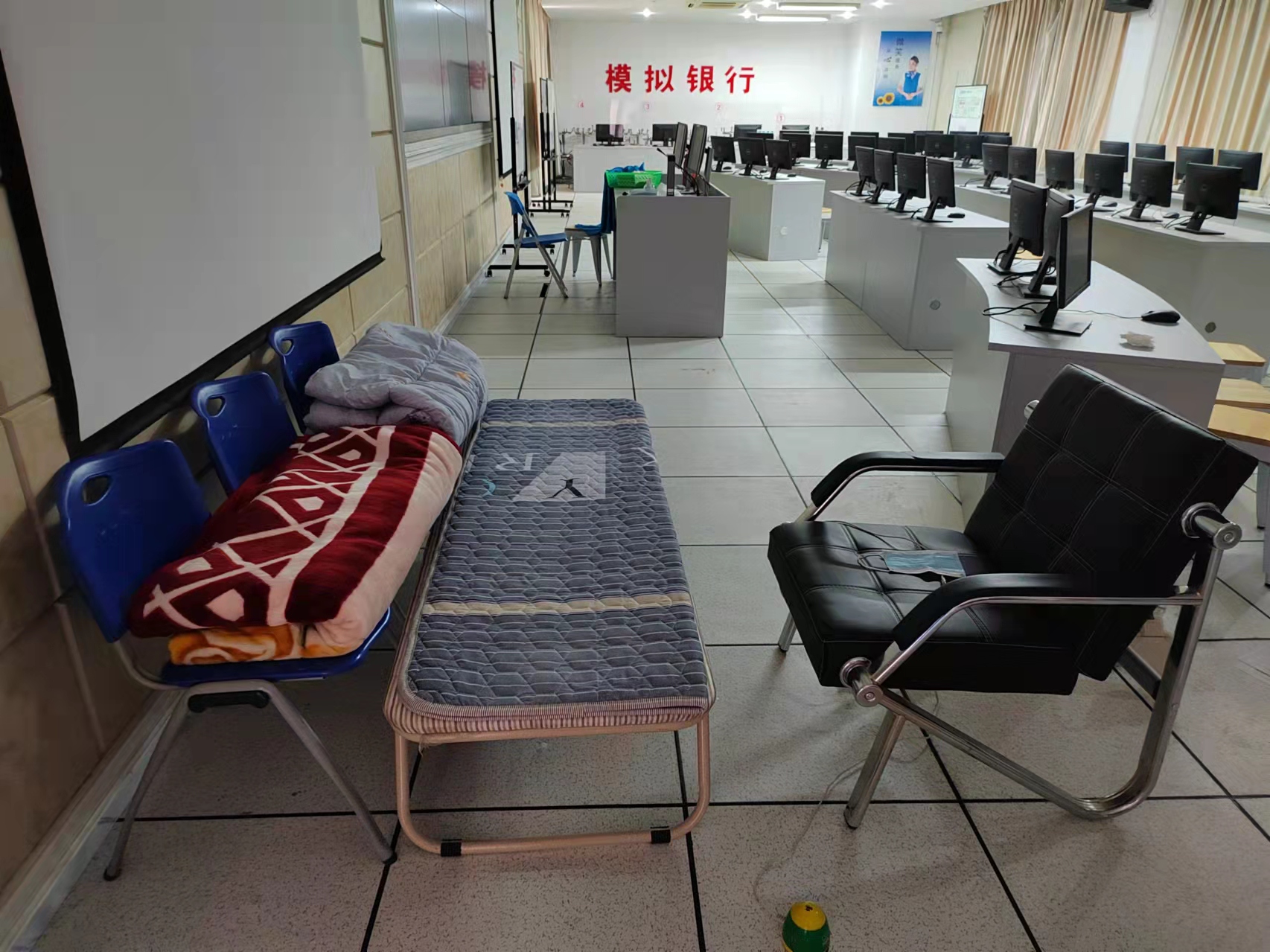 面对疫情防控的繁重任务,信息系教职工克服困难,以校为家,在简易的起居条件中全面投入抗疫工作,守护学生健康安全。