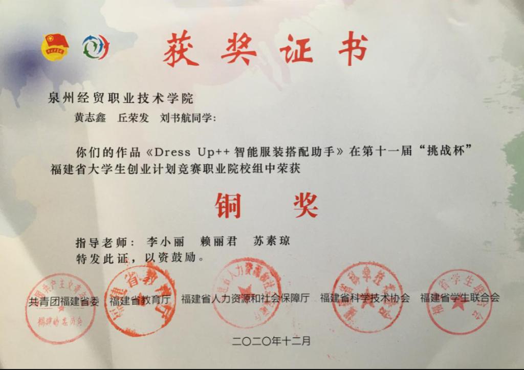 2021年1月7日,第十一届“挑战杯”福建省大学生创业计划竞赛和第九届福建省大学生“创业之星”评选在阳光学院闭幕。我系报送的参赛作品《Dress Up++智能服装搭配助手》荣获此次大学生创业计划竞赛职业院校组铜奖。