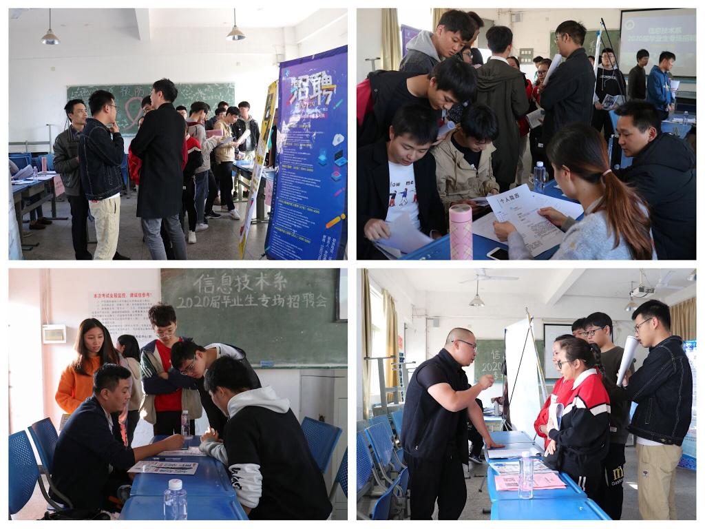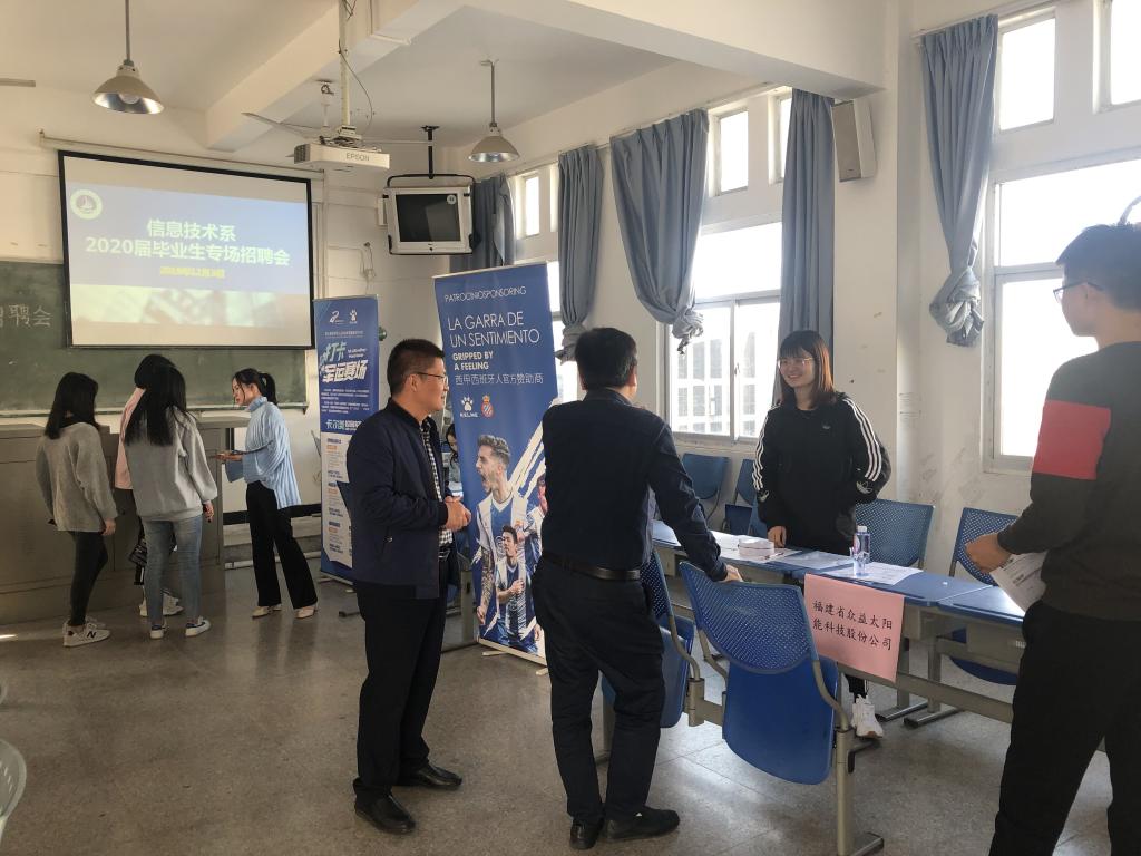 2019年12月3日下午,信息系在东教学楼教室举办2020届毕业生专场招聘会,参会企业共22家,225名毕业生参加本次招聘会现场求职。招就办负责人林水旺老师、信息技术系主任李展宗老师现场关心指导,了解参会企业相关信息。