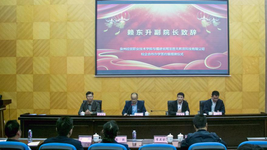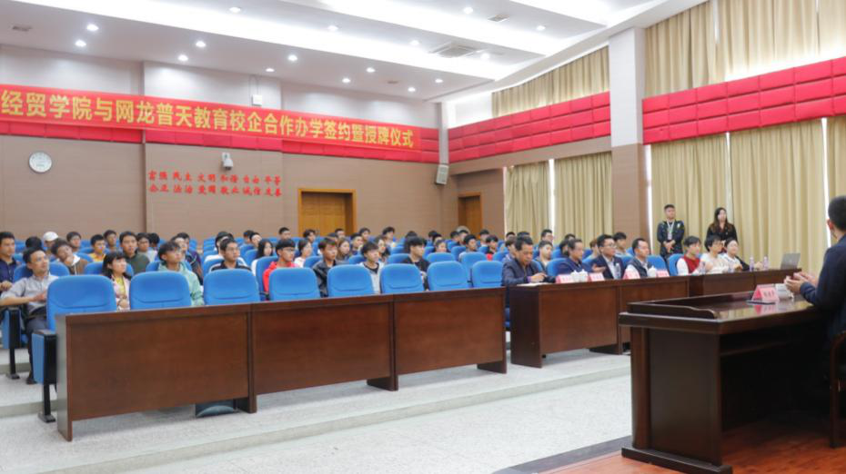 2019年11月26日下午,我院与福建省网龙普天教育科技有限公司在学术报告厅举行合作办学签约暨授牌仪式,出席本次仪式的有学院副院长赖东升、副院长花文苍、教务处副处长苏文民、信息系主任李展宗,福建省网龙普天教育科技有限公司总经理吴继平、副总经理林财华、销售经理张庆安、高级教学总监蔡毅、教学专员李妍君,信息技术系部分师生代表,本次仪式由信息系主任李展宗主持。