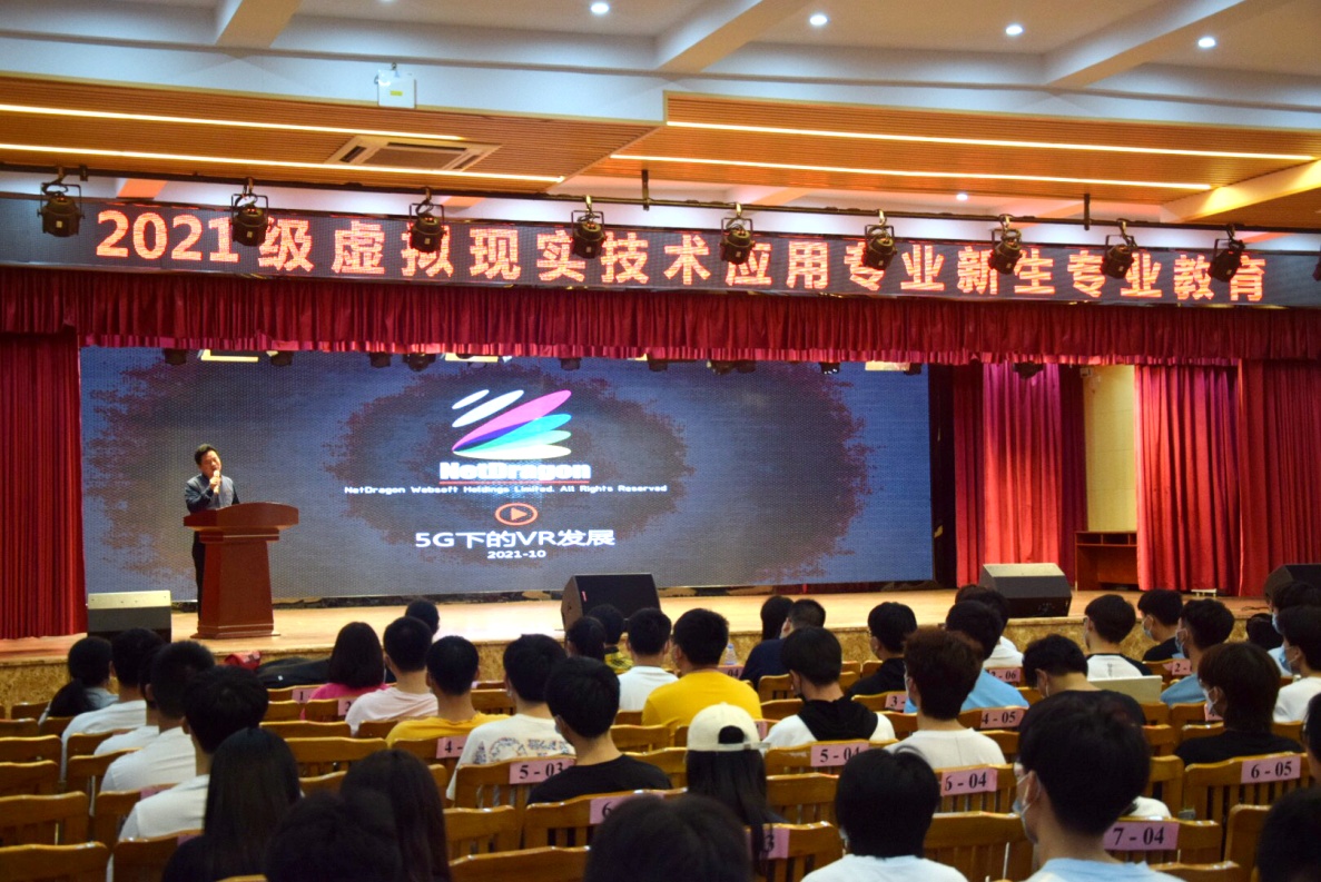 10月26日下午,网龙普天教学总监蔡毅为虚拟现实技术应用专业2021级新生举办专题讲座——《5G下的VR发展》。讲座开始前由信息技术系主任李展宗为2021级新生介绍了虚拟现实技术应用专业建设情况,以及在专业人才培养、实习实训、产教融合等方面与网龙开展深度合作情况,并对2021级新生的专业学习提出期望。