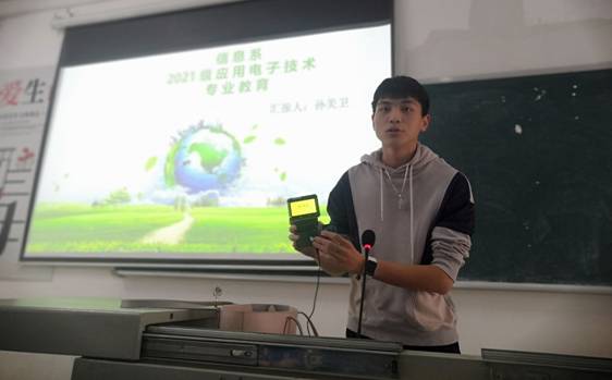 应用电子技术专业教育活动中还增加了新老生专业学习与实践经验交流环节,参加省级技能竞赛的三位学长现场为同学展示了一卡通管理系统、智能测温仪、SD智能小电视等作品。