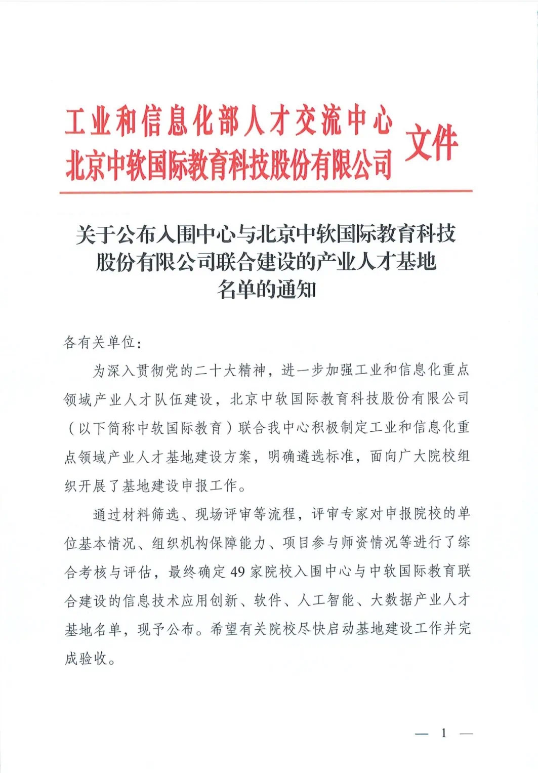 学院人才基地将联合北京中软国际教育科技股份有限公司与其他工业和信息化企业开展校企合作,进一步加强教育教学模式改革及人工智能专业群建设研究,依据产业人才标准,制定和升级人才培养方案,设计课程体系,开发课程教材、实训案例、课程资源等配套内容。通过数字化平台手段实现教学数字化改革,保障学生能力培养达成度,通过“政府、学校、行业、企业”多方协同完成教育教学模式改革,促进人工智能专业群高质量发展,全力推动产业人才基地的落地和建设,促进创新型、应用型、技术技能型产业人才的高水平培养,为泉州市培养输送产业人才,为进一步加强国家工业和信息化重点领域产业人才队伍建设贡献力量。