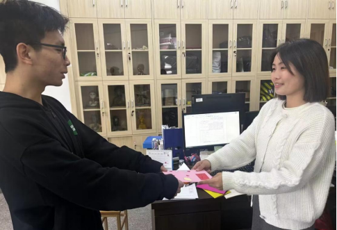 计应222的赖铭泉同学将自己精心制作的贺卡送给了辅导员周慧敏老师,他说,感谢辅导员老师无微不至的关怀之情以及细心的教导之情,这一学期的改变和进步都离不开老师的悉心教诲。