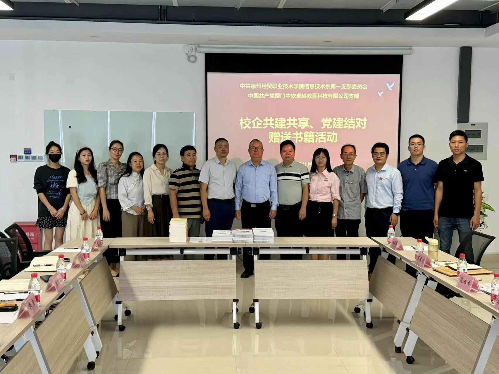 在校企党建结对共建赠送书籍环节,信息系第一支部向厦门中软卓越教育科技有限公司党支部捐赠党建书籍和人工智能专业技术书籍,旨在发挥双方资源共建共享,实现优势互补,深化党建引领下的产教融合工作。