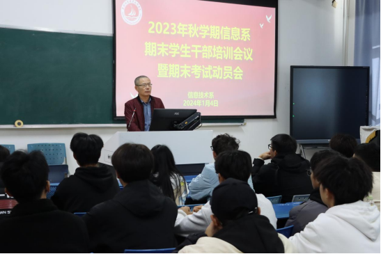 为深入学习贯彻习近平新时代中国特色社会主义思想,进一步落实期末各项工作,加强学风管理,信息系于1月4日中午在新教203召开本学期学生干部思政大课暨期末学生干部会议。信息系党总支书记李文辉主持此次会议。
