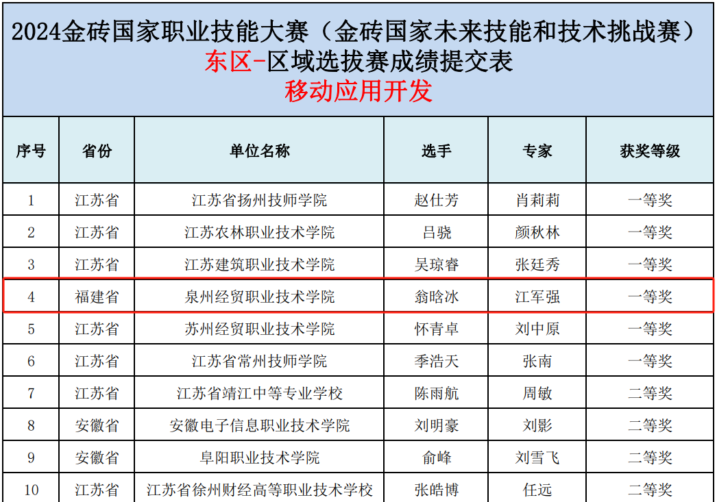 6月27日上午,2024金砖国家职业技能大赛移动应用开发赛项举行区域选拔赛。本次比赛采用线上比赛方式,分为东区、南区、西区、北区四个区域,共有来自全国各职业院校250支队伍参加此次比赛。我院信息系移动互联应用技术专业翁晗冰同学在东区67支参赛队伍中,成绩名列第四,省内名列第一,将代表福建省参加全国选拔赛暨国内总决赛。
