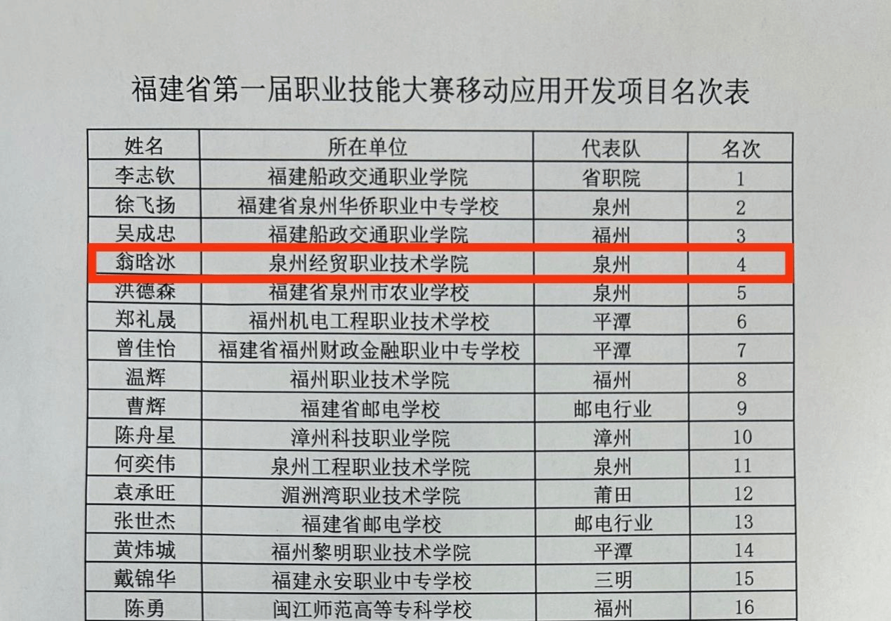 本次大赛由福建省人力资源和社会保障厅主办,旨在进一步推动我省技能人才队伍建设,激发广大技能人才的创新创造活力,为福建省的经济社会发展提供强有力的技术人才支撑。大赛汇聚了福建省各地市选送的35支队伍同台竞技,我院信息技术系移动互联应用技术专业翁晗冰同学(指导教师:江军强),以出色的技术实力和专业能力,在参赛者中脱颖而出,取得第四名的佳绩,为我院争得一份荣誉。