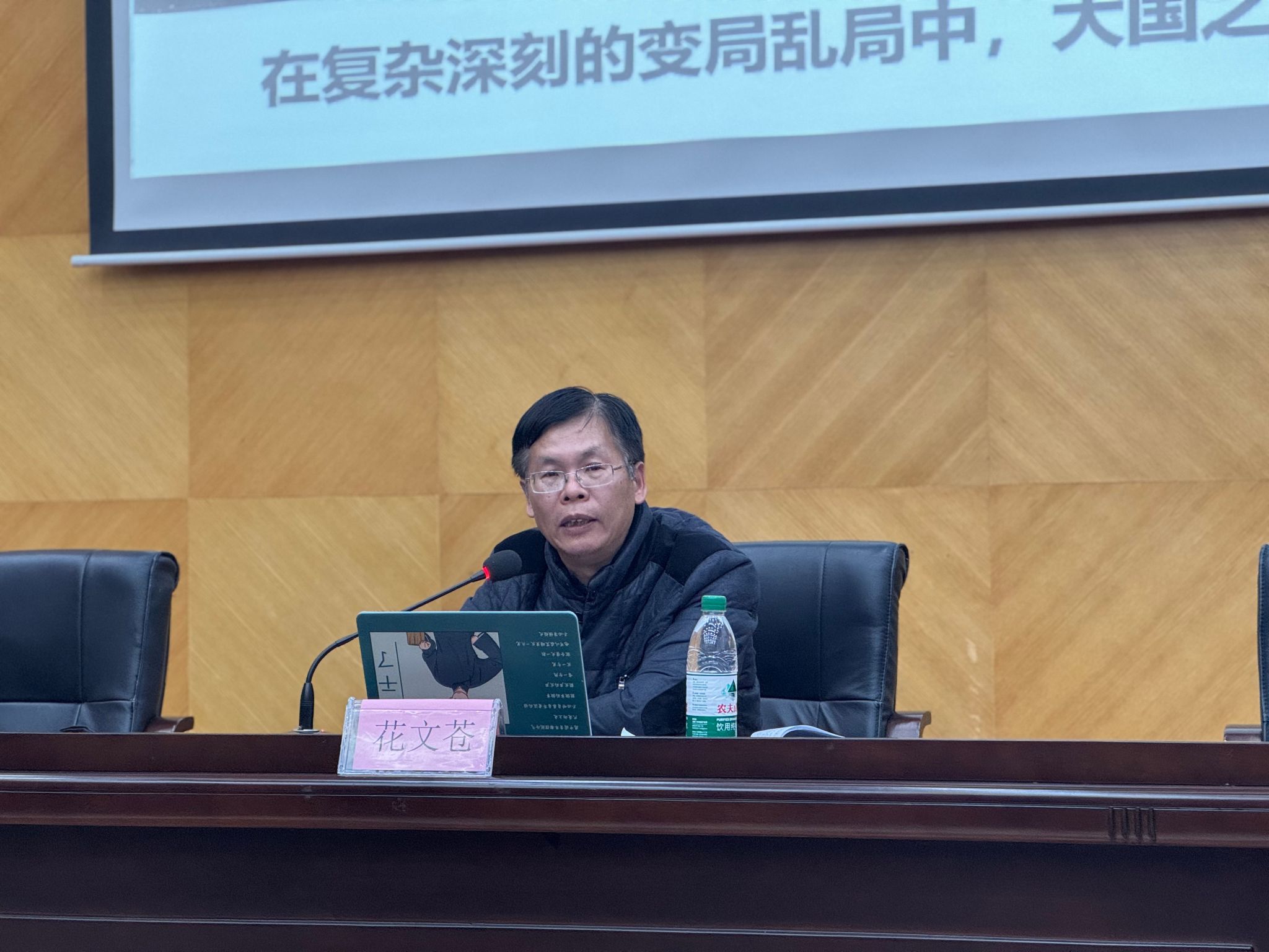 花文苍副院长从百年变局、动荡世界、责任担当及中国实践等四个方面对大国关系、中国面临的机遇与挑战进行了深入的分析。他强调,要坚定理想信念,始终保持对中国特色社会主义的坚定信仰;要以家国情怀为基石,将个人的命运与国家的命运紧密联系起来;要以更加开放的心态,积极学习借鉴国际先进经验,努力提升专业知识水平。同时勉励师生党员要时刻关注国际形势,以开放的心态吸收全球智慧,为新时代强国建设不懈奋斗、贡献力量。