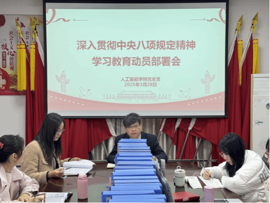 2025年3月28日,人工智能学院党总支在东教510会议室召开深入贯彻中央八项规定精神学习教育动员部署会,深入学习习近平总书记关于深入贯彻中央八项规定精神学习教育的重要讲话和重要指示精神,传达学习中央、省委、市委和学校党委有关会议精神和部署要求,并对学院开展学习教育工作进行动员部署。人工智能学院副院长叶茂樟主持会议并作专题部署。