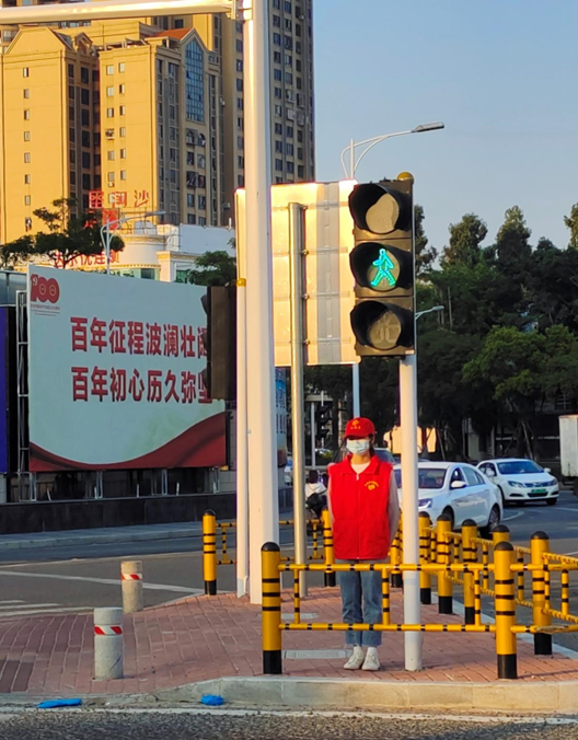 协助交警指挥行人和车辆禁止随意闯红灯,以示保证行人的安全,同时也减免交通事故的发生,以及预防交通堵塞的发生。
